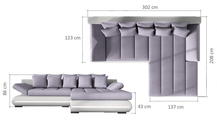 302 x 86 x 208 cm (szerokość x wysokość x głębokość)